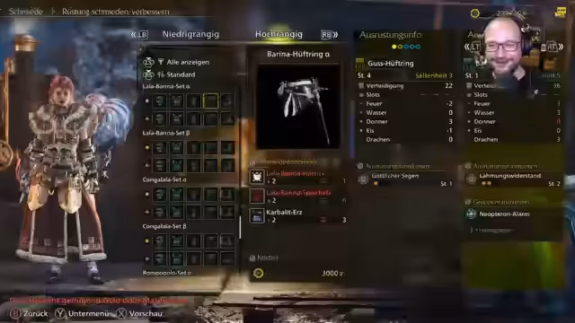 08:16:34Der Streamer benötigt eine Chatter Cabra Haut Plus, um die erste Rüstung im High Rank zu schmieden. Er vergleicht die Werte der Niedrigrangig und Hochrangig Rüstungen und stellt fest, dass die Hochrangig Rüstungen mehr Verteidigung und neue Ausrüstungsfähigkeiten haben. Er listet verschiedene Rüstungssets auf, darunter das Leder-Set, das Ketten-Set und das Bulakshi-Set mit der geilen Brille, die im Hochrangig rot ist. Er entdeckt weitere Rüstungssets wie das Talios Armschutz und das Vespuiden-Set mit vielen Einsatzslots. Er findet die Maske und das Kutku-Set. Er freut sich über die geilen Sets im Hochrangig und zieht Unbeeindruckt weiter. Er kommentiert die Barina-Sachen mit den Netzstrumpfhosen. Er hat noch nicht die Waffen angesehen, aber es gibt neue Seiten. Erstmal geht es nur bis zur Seltenheitsstufe 3 bei den Waffen. Er entdeckt die Hoffnungsdurche mit blauer Schärfe und zwei geilen Slots. Er möchte die rosa Barakas von Ajarakan haben. Er findet die Jan Kutku Waffen ordentlich stark, aber ohne blaue Schärfe. Er entdeckt noch neue Monster, die er noch gar nicht entdeckt hat.