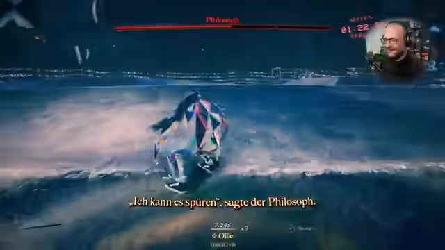 02:36:20Der Streamer bereitet sich auf einen Bosskampf vor, der als 'kosmisches Bestreben, den Mond zu verschlingen' beschrieben wird. Der Philosoph stellt eine Reihe von Fragen, die durch Skateboard-Tricks beantwortet werden müssen. Die erste Frage, ob seine Wohngefilde mit Skateboarden erreicht werden können, scheitert zunächst, da der Spiegel zu langsam ist. Die zweite Frage dreht sich darum, ob ein Geräusch erklingt, wenn ein Skater einen Trick ausführt und niemand zusieht. Hier fordert der Philosoph eine Viererkombo, um die Aufmerksamkeit aufrechtzuerhalten und mehr als nur einzelne Tricks zu zeigen. Der Streamer schafft eine Sechser-Kombo, was den Philosophen beeindruckt, aber er fragt nach einem besseren Weg, eine Kombo zu beenden.