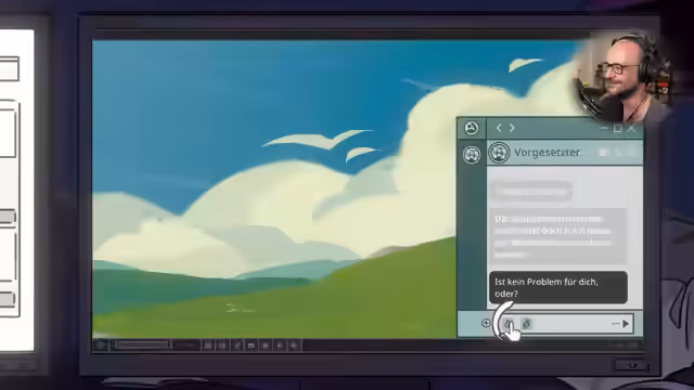 05:13:54Ein einzigartiges, interaktives Element wird eingeführt, in dem der Spieler in die Rolle einer Büroangestellten schlüpft, die Dateien bearbeiten muss. Dabei werden verschiedene grafische Objekte verändert und im Stil von Adobe-Software manipuliert. Dieses Rollenspiel-Element dient als humorvolle Unterbrechung des Hauptabenteuers und demonstriert die Vielseitigkeit des Spiels. Die gestellte Aufgabe, Logos zu skalieren und zu verschieben, wird erfolgreich gelöst.