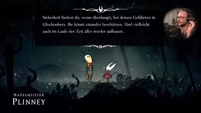 09:16:31Eine lange ersehnte Sprungpassage mit einer Bank kündigt einen bevorstehenden Kampf an, für den die Spielerin ihre Ausrüstung anpasst. Die Herausforderung der Sprungpassagen wird als belohnend empfunden, da die Steuerung des Spiels hervorragend ist. Die Notwendigkeit, Seide zu regenerieren, führt zu strategischen Entscheidungen, wie dem Töten von Gegnern zum Auffüllen. Der letzte Pilz, der „Pilzbär“, wird gefunden, was ohne die Hilfe der Community nicht möglich gewesen wäre. Die Begegnung mit „Wormkind“ und dem „großen weißen Orakelpilz“ führt zu tiefgründigen Dialogen über die Zukunft des Landes und die Rolle der Protagonistin. Die Entdeckung einer neuen Karte, neuer Gegner und der „endlosen Ödländer“ am Ende des Streams deutet auf weitere Abenteuer hin. Die Spielerin beschließt, die Käfer nicht einem „schwarzen Untergang“ zu überlassen und plant, weitere Geheimnisse zu lüften, bevor sie nach Falum absteigt.