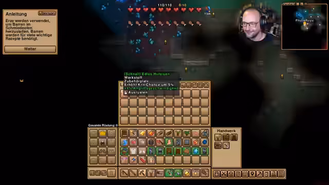 06:15:27Der Streamer stellt einen Schmiedeofen her und schmilzt Kupfer- und Eisenerze zu Barren um. Er entdeckt das Abenteuer-Tagebuch, das Informationen über Biome, Höhlen und Gegner liefert. Dabei plant er den Bau einer Siedlung und stellt fest, dass er Goldbarren für die Siedlungsflagge benötigt, aber kaum Golderze findet.