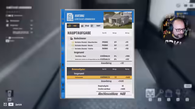 02:48:09Im Zeitfenster von 10089 bis 10118 akzeptiert der Streamer einen neuen Auftrag und stellt fest, dass es Kurierdienste gibt, die Artikel zu anderen Orten transportieren können. Er hat schon eine volle Palette Ziegelsteine, Bretter und eine Box für kleine Gegenstände. Im Zeitfenster von 10118 bis 10144 sucht er nach einem passenden Auftrag und findet einen 'Hurricane Horror', bei dem er ein teilweise zerstörtes Haus abbauen soll. Im Zeitfenster von 10145 bis 10169 erklärt das Spiel die Vertragserfüllung und wie viel Geld er bekommt, nachdem Strafen abgezogen wurden. Er erhält eine Bewertung von viereinhalb Sternen.