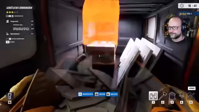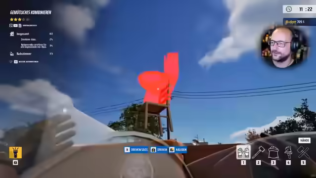 03:09:06Der Spieler erreicht das neue Haus und beginnt mit der Erkundung der Umgebung. Es werden humorvolle Kommentare über die Einrichtung und die Gegenstände im Haus gemacht. Der Spieler stellt fest, dass die Kunden Waschbecken, Dusche und Toilette behalten möchten, während der Rest des Hauses abgerissen und mitgenommen werden darf. Es wird die hohe Qualität des Spiels gelobt, obwohl es nur etwas über 13 Euro kostet. Der Spieler entdeckt einen Motorradhelm und einen Toaster mit einem Toaster-Symbol, was als lustig empfunden wird. Es wird ein sehr kleines Zimmer entdeckt, das an das Stream-Zimmer des Spielers erinnert. Der Spieler findet eine Dimensionsübergreifungsuhr und spekuliert darüber, wie die Gegenstände im Spiel weiterentwickelt werden könnten. Es wird eine luxuriöse Dusche entdeckt, die der Spieler auch gerne hätte. Der Spieler entfernt die Toilette und plant, wie die Dusche demontiert werden kann. Es wird festgestellt, dass der Abbau der Dusche sehr einfach ist. Der Spieler äußert sich kritisch über das Design der Toilette und die Position des Klopapiers. Es entwickelt sich eine Diskussion über verschiedene Arten, sich den Po abzuwischen, wobei der Spieler seine Vorliebe für das Sitzenbleiben betont.