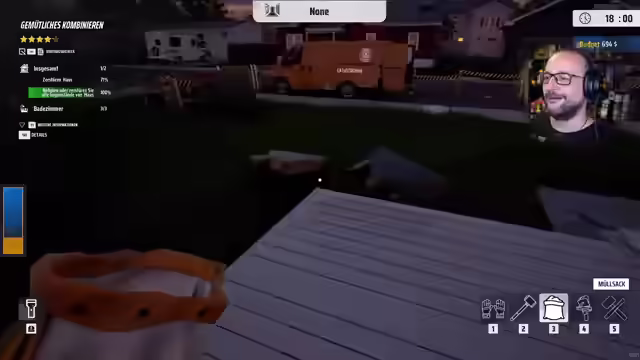 05:00:17Es wird überlegt, ob man die Tageszeit im Spiel ändern kann, um mehr Helligkeit zu haben, aber es wird verworfen, um den Spielfluss nicht zu stören. Es wird nach einem besseren Hammer im Spiel gesucht, aber es gibt keine verbesserte Version. Es wird überlegt, wo man das gefundene Bett im Spiel platzieren soll. Der Streamer äußert sich begeistert über die Grafik und das Gameplay des Spiels. Es wird überlegt, ob eine bessere Bewertung erzielt werden kann, wenn man schnell arbeitet. Es wird festgestellt, dass es keinen besseren Hammer im Spiel gibt, was bedauert wird. Es wird geschätzt, wie lange man für ein Haus im Spiel benötigt, und es wird erwähnt, dass es auch Speedrunner gibt, die das Spiel sehr schnell durchspielen. Es wird überlegt, ob man eine bessere Bewertung bekommt, wenn man schnell ist, aber es wird nicht bestätigt. Der Abriss des Hauses wird fortgesetzt, wobei die tragenden Wände entfernt werden. Es wird überlegt, ob man das Spiel als Therapie nutzen könnte, und es werden humorvolle Angebote gemacht, zuzuhören und Tee zu kochen, wenn jemand reden möchte. Es wird festgestellt, dass es im Spiel 18 Uhr bleibt und die Sonne nicht wieder aufgeht.
