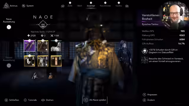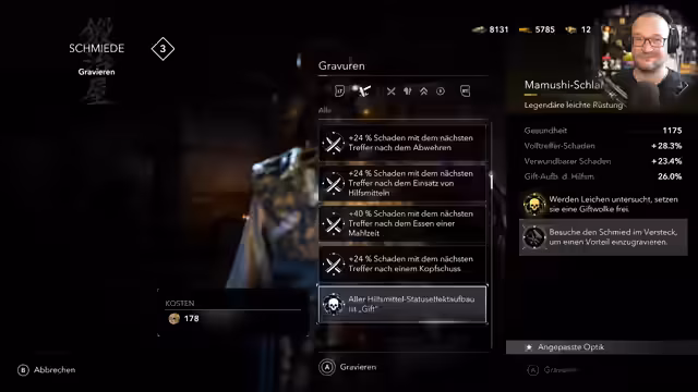 01:21:01Der Streamer konzentriert sich darauf, seine Ausrüstung zu verbessern, insbesondere das Tantou mit Giftaufbau. Er wählt spezifische Gravuren aus, um den Schaden durch Gift zu erhöhen und statuseffektbezogene Fähigkeiten zu optimieren. Dies geschieht vor seinem Angriff auf Akechi Mitsuhide. Der Streamer erklärt auch seine Philosophie bei der Wahl von Gravuren und welche er bevorzugt, je nach Spielziel.