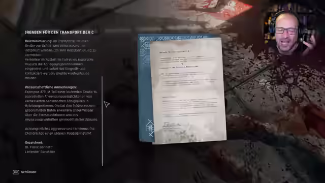 03:23:06Es werden Informationen zum Transport der Chimäre Nebulosa 47b präsentiert, einem genetisch stark modifizierten Versuchsobjekt mit verbesserten sensorischen Fähigkeiten. Besondere Vorsicht ist geboten, um eine Reizüberflutung zu vermeiden, und im Falle eines Ausbruchs sind spezielle Maßnahmen erforderlich. Die Chimäre wird als höchst aggressiv und territorial beschrieben, mit einem starken Raubtierinstinkt. Spekulationen über die Hintergründe der Charaktere Olivia und ihre Verbindung zu den Genetikern, Wissenschaftlern oder Baron Fischer werden angestellt. Die Blutspur der Chimäre führt in die Sümpfe und der Streamer äußert Bewunderung für den Charakter Kyle. Es wird die Entscheidung getroffen, einem Charakter nicht zu helfen, um sich selbst zu schützen, was zu einem Kommentar über 'People Pleasing' führt. Es wird ein fehlender Kopf an einem Stück Fleisch gefunden, was zu einem Verweis auf 'American History X' führt.