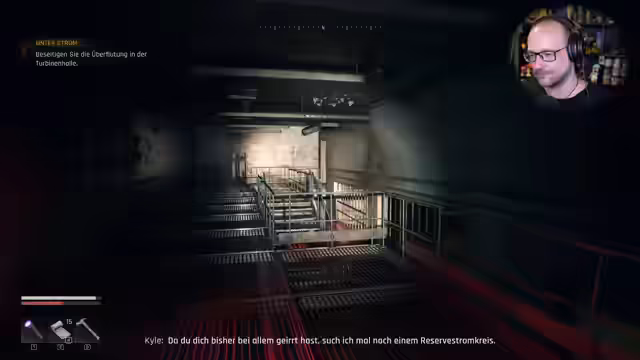 05:37:37Kyle erhält den Auftrag, die Überflutung in der Turbinenhalle zu beseitigen. Der Streamer hasst Schwimmen und hat Schwierigkeiten, oben zu bleiben. Die Geräusche unter Wasser werden als unangenehm empfunden. Es wird überlegt, wie man die Überflutung beseitigen kann und ob die Gegner noch am Leben sind. Der Streamer erinnert sich daran, den Flammenwerfer dabei zu haben. Es wird ironisch kommentiert, dass Kampftaucher täglich in solchen Umgebungen arbeiten. Largo wird mitgeteilt, dass kein Wasser mehr reinfließt, aber der überflutete Bereich noch trockengelegt werden muss. Der Streamer äußert seinen Optimismus, während Largo realistisch bleibt. Es wird ein Reservestromkreis gesucht, um die Pumpe mit Strom zu versorgen.