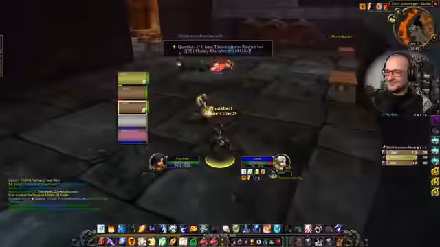 03:25:32Es werden Pläne für gemeinsame Gildenaktivitäten besprochen. Der Streamer möchte seine T0,5-Ausrüstung verbessern, indem er eine Quest in Blackrock Depths absolviert, um ein Rezept für Elementarfeuer-Transmutation zu erhalten. Er fragt im Chat nach, ob er einer Gruppe beitreten kann, und erwähnt den Hobbyzwergen 'Hobby-Bert', dem ein Shoutout gegeben wird.