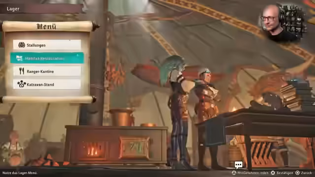 03:54:23Nach dem erfolgreichen Kampf wird das erste Lager errichtet. Dieses dient als zentraler Anlaufpunkt und ermöglicht verschiedene Aktionen. Der Streamer erkundert die Einrichtungen des Lagers, insbesondere die Ranger-Kantine, in der gekocht werden kann. Hier werden die verschiedenen Kategorien von Gerichten, wie Fleisch, Fisch und Gemüse, sowie ihre dauerhaften Boni erklärt. Es wird ein Gericht ausgewählt, das einen Bonus für die Objektsammlung im Feld gewährt. Neben dem Kochen wird auch das Schlüpfen von Eiern und die Interaktion mit anderen Charakteren im Lager gezeigt.
