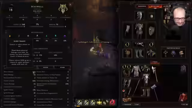 03:00:50Der Streamer wird älter gemacht. Ein Zuschauer verabschiedet sich. Eine zweihändige Waffe mit Chance to Bleed und Ignite wird gefunden, ist aber nicht geeignet. Mehrere verschenkte Subs werden bedankt. Die Drops werden erklärt: Chance to Bleed on Hit vs. on Melee Hit. Die Hämmer sind kein Melee. Es wird auf die Scaling-Tags verwiesen. Es wird empfohlen, die Sachen im Spiel auszuprobieren. Throwing Attack Speed ist auf einem anderen Amulett. Das arme Brot wird bedankt. Einige Sachen müssen doppelt und dreifach nachgelesen werden. Es wird online gespielt. Ein Unique wird gefunden. Strong, Asset und Wongfei-Hung werden bedankt. Wongfei-Hung war das Lied von Jackie Chan. Celestial Hammerthrow wird noch nicht angesehen. Hammer auf Laurent: Chill on Hit, increased melee damage, melee physical damage per level, increased melee stun chance. Nicht brauchbar. Crafting ist da. Chance to Bleed on Hit kann auf das gute Teil draufgepackt werden. Ein Critical Success wird erzielt. Chance to Bleed wird zu Chance to Ignite. Damit sind es 49 Chance to Ignite per Hit. Es kann auch über 100% gehen. Die Weaver-Mechanik wird erwartet. Ein Goldschrein wird gefunden. Es muss zurück in die Stadt, um etwas abzugeben. Es wird sich auf Hack'n'Slay gefreut. Grim Dawn und Wolzen waren nicht so gut. Warpath ist auch super stark und super gut. Kraxler wird bedankt. Hallöchen wird bedankt. Grim Dawn war zu langsam und träge. Ein Auto ist eine dumme Sache zum Kaufen. Throwing Damage wird gefunden, aber dann verliert man Chance to Ignite.