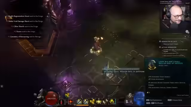 09:46:45Die erste Weaver's Tomb wird betreten, um die Story zu erkunden. Es werden Gegner getötet und Schatztruhen geöffnet. Es wird festgestellt, dass man Gegner verstärken kann, um besseren Loot zu erhalten. Neue Idols mit neuen Eigenschaften werden gefunden. Die Möglichkeit, Idols umzucraften, wird als 'krank' bezeichnet. Es werden Gegner verstärkt und besiegt. Es werden Items mit Lightning Penetration und Elemental Resistance gefunden. Handschuhe mit Ward Retention und Ward Per Second werden gefunden und als sehr gut bewertet. Es wird über das Gegner-Scaling diskutiert und vermutet, dass der Endboss sehr stark sein wird. Es werden Items mit Void Penetration, Necrotic Penetration und Poison Damage gefunden. Eine seltene Echse wird entdeckt und besiegt. Es wird ein neues Rift gefunden und als viel besser als zuvor empfunden. Ein Boss wird besiegt und eine Truhe geöffnet. Ein Class Specific Idol für den Sentinel wird gefunden und verzaubert. Es wird ein Unique Ring gefunden. Das Spiel soll neu gestartet werden, um Serverprobleme zu beheben.