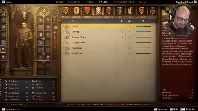 02:31:28Es werden die flexiblen Kleidungssätze vorgestellt, mit denen der Spieler drei unterschiedliche Outfits für Situationen wie Nahkampf, heimliche Missionen oder repräsentative Anlässe speichern und schnell wechseln kann. Jeder Satz wird durch ein Wappen identifiziert. Danach schaltet der Streamer zu den Charakter-Attributen über, die die Grundlagen des Spielers definieren. Er diskutiert die Bedeutung von Stärke, die in mittelalterlichen Helden eine zentrale Rolle spielt und den Kampfschaden beeinflusst, sowie die Werte Agilität, Vitalität, Ausdauer und Redekunst.