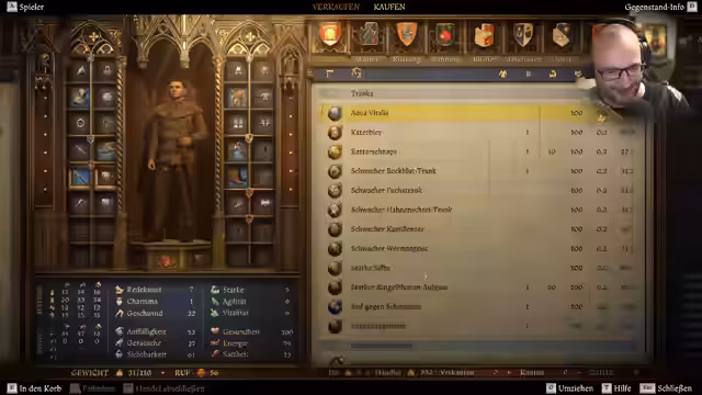 08:57:15Im Handelshaus versucht der Streamer, seine geplünderten Gegenstände zu verkaufen. Er ist mit den angeboteten Preisen unzufrieden und feilscht erfolgreich. Er lässt sich schließlich auf einen Preis von 50 Groschen für seine Waren ein. Anschließend rüstet er seine Waffen, darunter sein militärisches Schwert, an einem Schleifstein, um ihre Qualität und Schärfe zu verbessern, bevor er die Stadt verlässt.