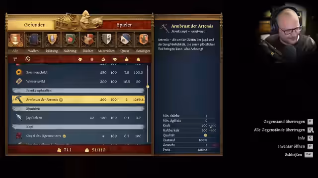 02:28:02Der Streamer zeigt das Inventar und erklärt das Spielermenü von Kingdom Come Deliverance 2. Das Menü ist in sechs Abschnitte unterteilt, die über einen oberen Wegweiser angezeigt werden. Spieler können direkt im Spiel zu den verschiedenen Abschnitten wechseln. Im Inventar können Gegenstände nach Menge, Stärke, Qualität, Gewicht, Preis oder alphabetisch sortiert und Kategorien angezeigt oder verborgen werden. Ein Symbol zeigt an, ob Heinrich einen Gegenstand in einem Kleidungssatz angelegt hat. Vergiftete oder gestohlene Gegenstände werden ebenfalls gekennzeichnet. Die jetzige Tragelast, Kapazität und das Geld werden angezeigt. Spieler können Gegenstände fallen lassen, den Gürtel bearbeiten und Gegenstände auf die Schnellauswahl legen. Es gibt verschiedene Ausrüstungsplätze für Hüte, Helmpolsterung, Halsschutz, Ringe, Halsketten, Brustplatten, Mäntel, Hemden, Handschuhe, Hosen, Stiefel und mehr. Heinrichs Attribute werden beeinflusst, wenn ein Gegenstand ausgewählt wird. Es gibt Regeln beim Anlegen von Rüstungen zu beachten, um den besten Schutz zu gewährleisten. Unter dem Helm muss immer ein zusätzlicher Kopfschutz getragen werden, und ein Gambison dient als Polsterung unter der Brustplatte. Gesteppte Hosen dienen als Polsterung unter der Beinrüstung, und Schuhe müssen vor Sporen angezogen werden.