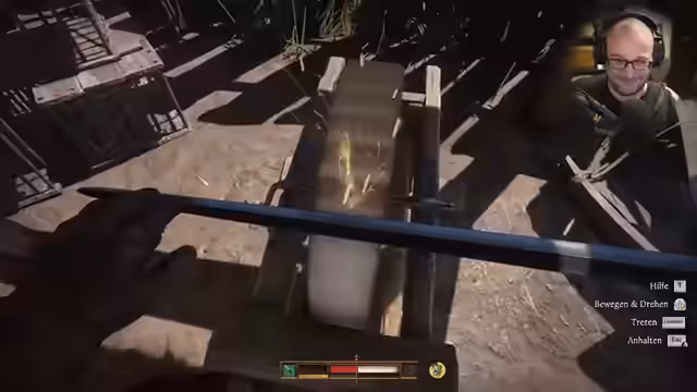 02:50:04Nach einer kurzen Erholungspause beginnt der Streamer ein intensives Schwertkampf-Training mit seinem Begleiter Hans. Er erlernt die grundlegende Mechanik des Kampfsystems: Angriffe werden mit dem Linksklick in verschiedenen Richtungen ausgeführt, während die rechte Maustaste zum Blocken dient. Der Höhepunkt ist ein Duell, bei dem der Streamer versucht, erlernte Techniken wie Angriffsketten, perfekte Blöcke und Gegenschläge anzuwenden, wobei er seine Ausdauer sorgfältig verwalten muss.