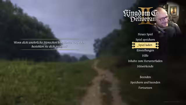 01:40:54Nach einer kurzen Pause startet der Streamer endlich in Kingdom Come Deliverance 2. Er bewundert die beeindruckende Grafik und die detailreiche, immersiv gestaltete Welt des 15. Jahrhunderts in Böhmen. Er steuert die Figur Heinrich, dessen Dorf von dem Bösewicht Siegbert überfallen wurde, und begleitet seinen Freund Hans, um eine wichtige Botschaft nach Troski zu bringen. Die deutsche Sprachausgabe und die Musik werden besonders gelobt.