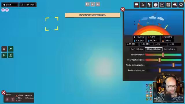 02:25:45Zu Beginn des Streams wird das Konzept der Erdneigung und deren Auswirkungen auf die Jahreszeiten besprochen. Anschließend stößt der Streamer auf das Spiel 'From Dust'. Zunächst unklar über die Aufgaben, beginnt er mit dem Ziel, einen Planeten durch Einschläge von Kometen mit Wasser zu versorgen und so eine Atmosphäre zu erschaffen. Der erste Kometeneinschlag führt zwar zu einer Zerstörung der Lavaoberfläche, bringt aber auch die gewünschte Wassermenge.