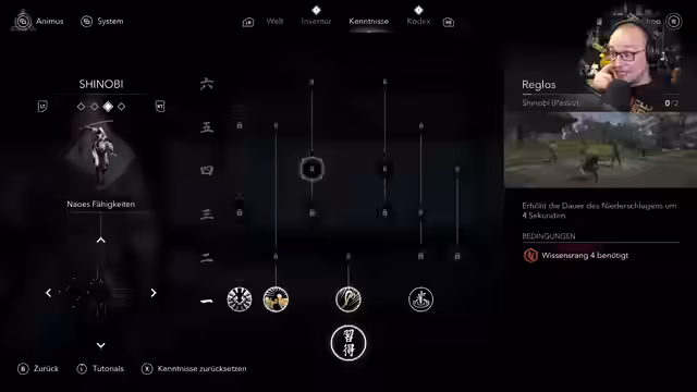 04:38:15Der Fokus liegt auf den Stealth-Elementen der Figur Naoe. Ihre Bewegungen sind lautlos, sie kann mit einem Greifhaken schnell klettern und sich im Wasser mit Schilfrohr verstecken. Eine zentrale Mechanik ist das Attentat an Shoji-Türen, das jedoch noch nicht verfügbar ist. Die Story beginnt mit einem katana-Schrein, wo ein Familienerbstück gefunden wird. Es wird eine Schlüsselquest gestartet, bei der der Protagonist in ein Dorf geht und dort auf Dorfbewohner trifft, die ihm helfen sollen.