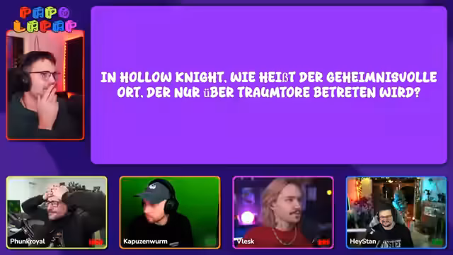 01:53:59Im Fokus stehen nun 'GamingStepUp'-Fragen: Treppen müssen Spielen zugeordnet werden. Beispiele: CS:GO (300 Punkte), Bioshock (400 Punkte), Control/Backrooms (600 Punkte) und Ocarina of Time (500 Punkte). Die Teilnehmer nutzen Strategien wie Punkterisiko (Stan wählt 600 für Escape the Backrooms) und Diskussionen über Grafikstile. Putzi erzielt mit Hollow-Knight-Wissen Punkte.