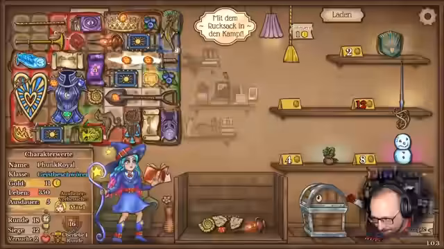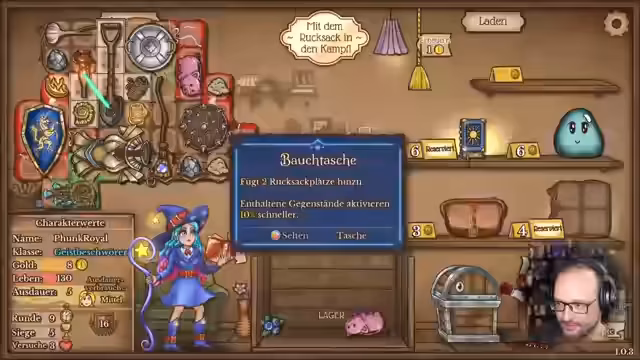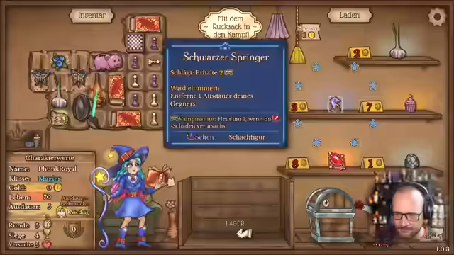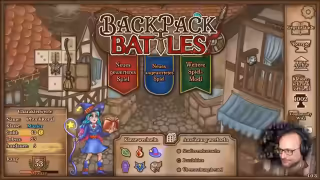 01:59:02Der Streamer beginnt mit dem Spiel Backpack Battles und möchte als Magier spielen, da er diese Figur noch nie ausprobiert hat. Er erklärt die Mechaniken der Magier-Figur mit besonderen Fähigkeiten wie Mana-Generierung und Zauber-Effekten. Er probiert verschiedene Gegenstände wie die Studierendentasche und Puzzlekiste aus und baut einen ersten Build mit Schachfiguren auf. Das Ziel ist es, durch strategische Platzierung der Figuren den Gegner zu schwächen und sich selbst zu heilen.