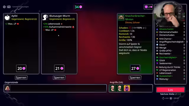 02:20:59Der Streamer beschreitet neue Wellen und trifft Entscheidungen über die Ausrüstung und die Diener-Komposition. Es geht um den Abwägung zwischen Rüstung und Schaden, sowie darum, ob man für mehr Lebenspunkte oder für aggressivere Builds wie mehr Kritische Treffer entscheiden soll. Synergien, wie die Erhöhung des Diener-Schadens durch Gegenstände oder die Nutzung von bonusbasierten Items wie 'Seelenernte', werden strategisch eingesetzt, um stärkere Builds zu erstellen und über Runden hinweg zu überleben.