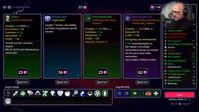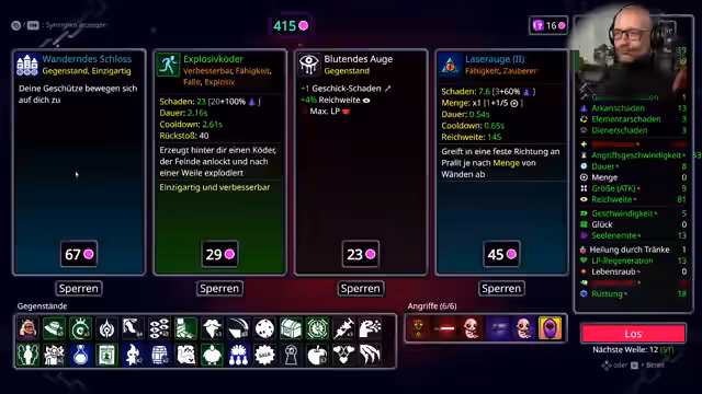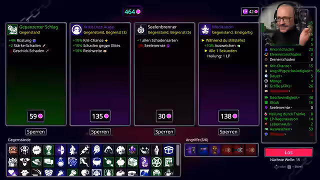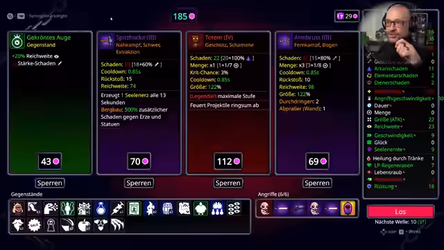 04:01:32Zunächst steht das Management von Gegenständen und die Bewältigung von Gegnerwellen im Fokus. Der Streamer sammelt Seelen und stirbt möglichst nicht. Es werden strategische Entscheidungen getroffen, wie die Wahl zwischen Geschwindigkeit, Lebensraub und Glück, sowie die Entscheidung für bestimmte Items wie ein Laserauge und ein Feuertotem. Die Komplexität wird durch die Notwendigkeit betont, Gegner effizient zu bekämpfen, ohne selbst zu sterben, und die richtige Balance für den Erfolg zu finden. Der Fortschritt und die Freude an der Mechanik werden deutlich.