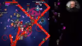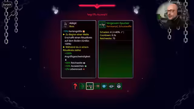 03:16:28Der Streamer kämpft gegen einen Boss und stellt fest, dass seine Angriffe zwar langsam sind, aber durch eingestellte Items effektiv werden. Er beschreibt, wie er in einem "Ritualkreis" steht und Bonusse wie erhöhte Angriffsgeschwindigkeit und Reichweite nutzt. Er bemerkt, dass die "Noobs" im Chat gefährlicher werden und sein Spielstil mit dem "Adepten"-Item, das einen Kreis mit Boni erschafft, effizienter wird.