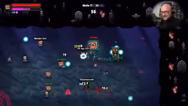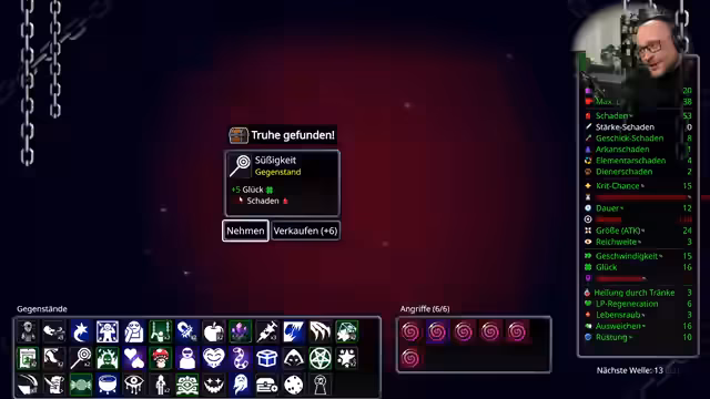 03:59:54Der Streamer befindet sich in der vorletzten Welle (Welle 19) und konzentriert sich darauf, maximalen Schaden zu machen. Er probiert neue Items wie "Knallestrol" und plant, in Zukunft beherzt und grinsend Bossen entgegenzulaufen. Er erkennt, dass die Menge an Gegneranzahl nichts bringt, weshalb er stattdessen auf "Gegensätzliche Herzen" und "Lebenspunkte" setzt. Das Ziel ist, die letzten Gegner schnell zu eliminieren, bevor sie zu stark werden.