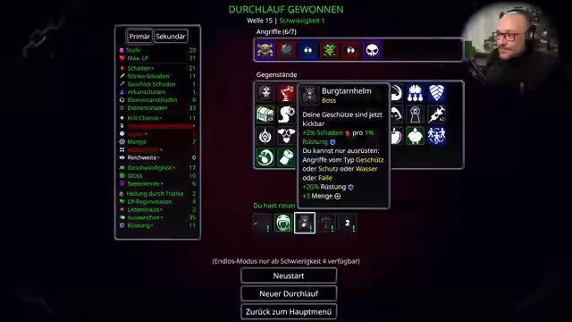 02:31:29Nach mehreren Wellen trifft der Streamer auf einen Bossgegner, 'NoLife', der aus dem Chat-Namen stammt. Obwohl der Boss anspruchsvoller ist, wird er besiegt. Als Belohnung wird der 'Burgtarnhelm' freigespielt, was einen Durchlauf des Spiels auf Schwierigkeitsgrad 2 ermöglicht. Das Spielprinzip wechselt nun von Diener-Summoning zum Platzieren von Geschützen, Fallen und Totems. Eine neue Waffe, die 'Balliste', wird freigespielt und genutzt, um den neuen, herausfordernden Gameplay-Stil zu erkunden.