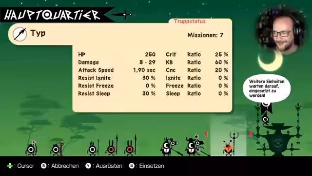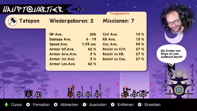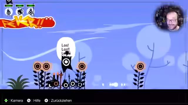 02:12:53Der Streamer setzt sein Patapon-Spiel fort und navigiert mit seinen Einheiten durch die Welt, um Nahrung zu sammeln und Kämpfe zu bestreiten. Er zeigt, wie er seine Krieger ausrüstet und in Formationen positioniert. Dabei entstehen einige Herausforderungen, da er Schwierigkeiten hat, gleichzeitig den Takt zu halten, Befehle zu geben und im Spielgeschehen erfolgreich zu sein. Er verliert sogar einige Einheiten in einem Kampf.