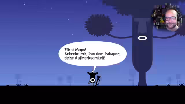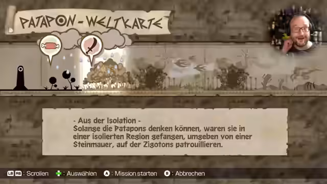 04:29:31Der Streamer beginnt mit der Patapon-Geschichte, bei der die Patapon auf einer Reise zu Erdend sind. Nach einem Schiffbruch landet ein einsamer Hatapon mit der heiligen Trommel an einem unbekannten Strand. Er spielt Trommel und trifft den Patapon Fürst Mops, der ihm hilft. Gemeinsam setzen sie ihre Reise fort.