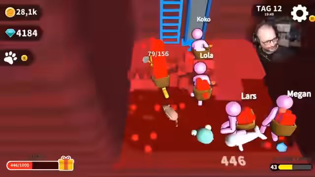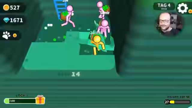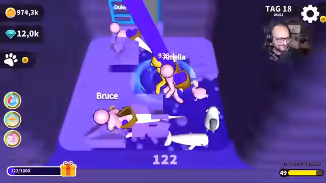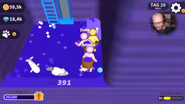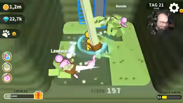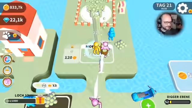 04:30:20Nach einer Pause wird das Spiel wieder aufgenommen. Zuerst wird ein Moped gekauft und ein permanenter Roller freigeschaltet, um schneller zwischen den Inseln zu navigieren. Es wird die fünfte Insel erreicht und die Eisinsel betreten, gefolgt von der roten Todeszone. Da noch lila Bälle aus dem vorherigen Loch vorhanden sind, muss zuerst zu diesem zurückgekehrt werden, um sie abzuliefern. Der Streamer plant, die Einnahmen aus Juwelen für Buffs zu nutzen und neue Mitarbeiter einzustellen, um die Effizienz zu steigern.
