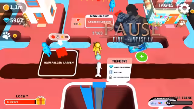 07:54:02Das Ziel des Spiels, das Einsammeln von 43.000 Diamanten, steht kurz vor dem Abschluss. Nach über sechs Stunden Spielzeit und der Berechnung der täglichen Zinsen ('Interest') fehlen nur noch wenige Tage, um das letzte Achievement zu erreichen. Eine 'Diamantenebene' wird gefunden, um schneller ans Ziel zu kommen. Parallel dazu wird die Zeitdauer eines Ingame-Tages berechnet, der etwa 28,66 Minuten in Echtzeit entspricht, und die wiederkehrende Musik des Spiels als prägend empfunden.