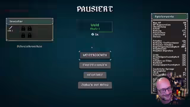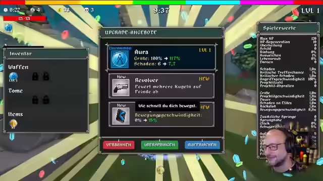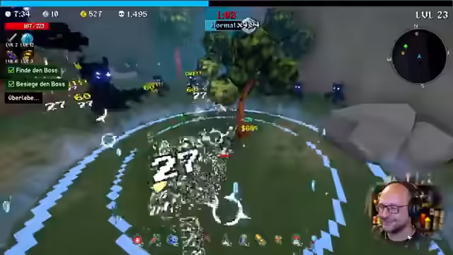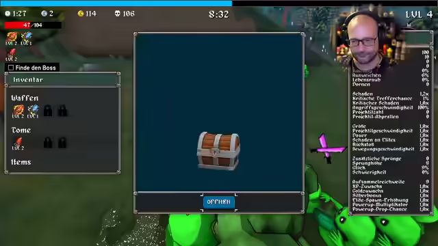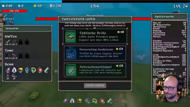 04:47:51Der Charakter stirbt, aber das Spiel belohnt den Tod mit neuen Sachen. Ein neuer Rekord wird aufgestellt und der Weltranglistenplatz analysiert. Es werden Freischaltungen und Quests abgeschlossen. Verschiedene Waffen und Zauberbücher werden vorgestellt. Die taktische Brille wird freigeschaltet, die 20% mehr Schaden gegen Gegner mit über 90% Leben verursacht. Es wird auf Sir Ufi gewechselt und der Wald erneut betreten. Ziel ist es, den Highscore von 485 Tötungen zu übertreffen. Die Musik wird als geil empfunden. Es wird überlegt, ob die Schwierigkeit erhöht wurde. Es werden verschiedene Gegenstände und Fähigkeiten ausprobiert. Ein Magnetschreien des Saugers wird aktiviert. Es wird auf Schaden oder Ausweichen gesetzt. Die Angriffsgeschwindigkeit wird erhöht. Es wird festgestellt, dass die Holzboxen nicht zerstört werden können. Die Bewegungsgeschwindigkeit wird erhöht, wenn Schaden genommen wird. Es wird auf Borga beim Kill gehofft. Es wird festgestellt, dass Ausweichen ein Cap hat. Verschiedene Raritäten werden gefunden und Glück als entscheidender Faktor erkannt.
