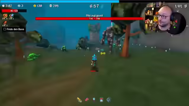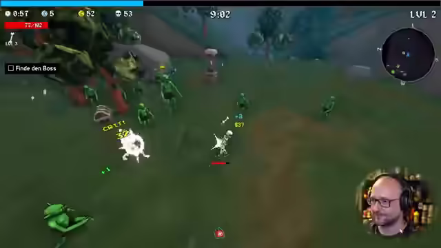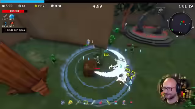 04:36:16Es werden erste Schritte in Megabonk unternommen, das Spielprinzip erklärt und die automatische Zielfunktion des Charakters hervorgehoben. Kisten können durch Draufspringen geöffnet werden. Nach dem ersten Level-Up stehen verschiedene Optionen zur Auswahl, darunter passive und aktive Fähigkeiten sowie Items. Es wird überlegt, ob Items ähnlich wie in Risk of Rain 2 funktionieren. Der Blitzstab wird ausgewählt. Es werden zwei Waffen kombiniert und die Minimap genutzt, um sich zu orientieren. Ein Turm wird entdeckt und Herausforderungen gemeistert. Es werden Totenschädel als Kills gesammelt und die Metaprogression-Währung identifiziert. Goldene Handschuhe werden gefunden, die mehr Gold von besiegten Gegnern bringen. Eine Kreditkarte erhöht den Schaden für jede geöffnete Truhe permanent. Der Feuerstab wird verbessert und die Minimap als wichtiges Hilfsmittel erkannt. Es wird überlegt, ob der Preis der Truhen von Level, Zeit oder bereits geöffneten Truhen abhängt.