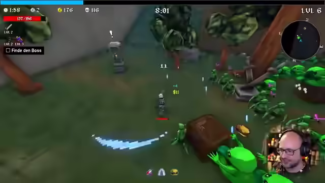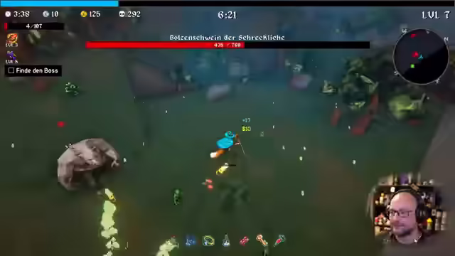 06:06:09Der Streamer sieht den Boss durch einen roten Wirbel und kämpft gegen zwei Bosse gleichzeitig. Er wählt Projekt Tattoo als Upgrade und kommentiert, dass er sein Level-Up selber bestimmen möchte. Der Streamer braucht Heilung und Bewegungsgeschwindigkeit. Er fragt den Chat, ob es eine Möglichkeit gibt, Bewegungsgeschwindigkeit zu verbessern, da diese am Anfang grausam ist. Der Streamer stirbt und kommentiert seine Probleme mit der Steuerung und der Geschwindigkeit. Er bewegt sich wie auf Eis und ist lahm wie Kacke, rückwärts. Der Streamer muss den Monkey freischalten und die Waffe Banane kaufen. Er geht zurück zu Waldstufe 1, da er in Stufe 2 keine Schnitte hat. Der Streamer springt, um schneller zu werden, und erinnert sich an die alte Version von CSGO, als man mit einer Deagle beim Springen 100% Accuracy hatte.