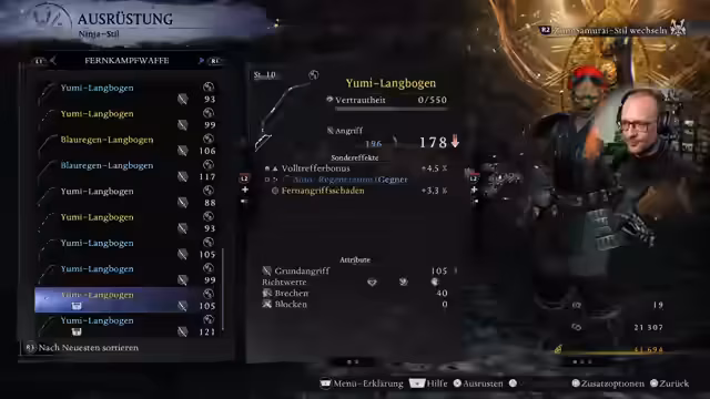 07:54:18Der Streamer sortiert und analysiert seine umfangreichen Ausrungsgegenstände nach verschiedenen Kriterien wie Stufe, Seltenheit und Angriff. Er bewertet diverse Rüstungsstücke, Helme und Waffen, wobei er auf spezielle Boni wie 'Seelenkern-Drop-Rate', 'Amrita-Absorption' und 'Feuerschadenreduktion' achtet. Er entscheidet sich für neue Teile, die seine Verteidigung und Spezialboni verbessern, und sperrt diese, um sie später nicht versehentlich zu verkaufen oder zu zerlegen.