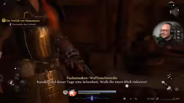 05:23:31Nach einer Pause wird der Streamer vom Chat gegrüßt und wird mit einem 'Raid' bedacht. Er setzt das Spiel fort und betrachtet die neue Mission 'Folge den Spuren des Geistes', die in der Burg Hamamatsu spielt. Er interagiert mit verschiedenen Objekten wie Flaggen und Yo-Kai-Feldern, die automatisch aufgesammelt werden. Bei der Erkundung wird er von einem Pferd getötet, was zu humorvollen Kommentaren im Chat führt.
