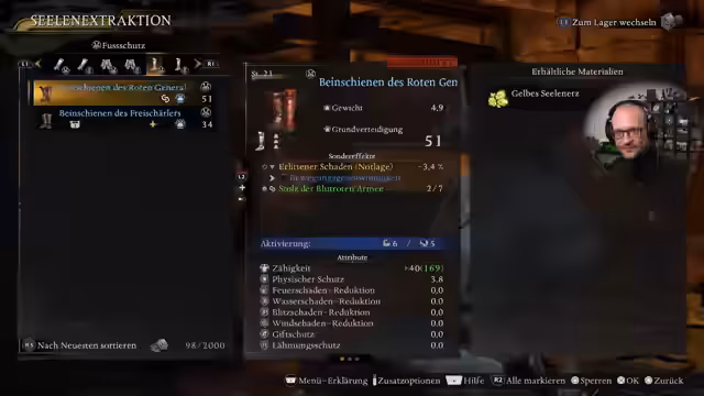 07:50:23Auf dem Weg zur Schmieden bespricht der Streamer das Fehlen einer deutschen Sprachausgabe, was für ihn eine Barriere darstellt, er findet aber deutsche Untertitel als ausreichend. Er verbessert seine Ausrüstung durch das 'Seelenbild'-System, um Pluswerte zu erhöhen, und beginnt, eine Waffe auf Plus 5 zu verstärken, was eine Million Gold und Azurblauseelen-Erz kostet. Außerdem nutzt er die 'Seelenextraktion', um Gegenstände zu zerlegen und Materialien für zukünftige Verstärkungen zu gewinnen.