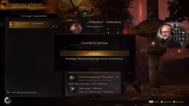 05:58:50Der Streamer erreicht die Schmiedin in der Burg Futamata. Sie leidet an Amnesie und erinnert sich nur vage an einen treuen Kunden, der oft ihren Laden besuchte. Der Streamer erkundigt sich nach der Bedeutung von Seelenfragmenten und stellt fest, dass man durch das Opfern von Seelenkernen diese erhalten kann, um später Bonis freizuschalten. Er führt ein 'Ruhritual' durch, um seine überflüssigen Seelenkerne in Seelenfragmente umzuwandeln, und erhält neue Gegenstände als Belohnung.