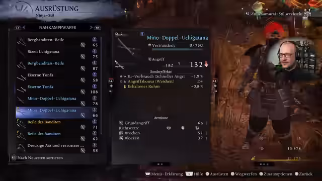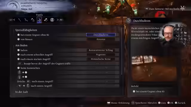 02:24:51Der Streamer erkundet die Ninja-Waffen, insbesondere die Doppelkatanen, und sucht nach speziellen Fähigkeiten wie 'Wolkenspalter Feuer'. Nach intensiver Suche in den Fähigkeiten-Menüs findet er die gewünschte Attacke, die beim Sprung einen kreisenden Schlag auslöst, und zeigt sich begeistert vom Fund. Parallel dazu wird die passive Fähigkeit 'Verweilender Geist' freigeschaltet, die nach dem Tod 30% des gesammelten Amrita behält.