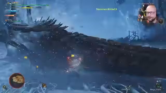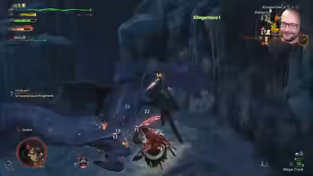 04:13:40Der Streamer kämpft gegen das Monster Schwarze Flamme und experimentiert mit verschiedenen Kampftaktiken. Er beschreibt die Herausforderung, besonders bei der Bewegung des Monsters, und teilt eine Entdeckung mit: Ein Video zeigte, dass man mit Greatsword Tentakel des Monsters abhacken kann, was er nicht gewusst hatte. Er verwendet Dual Blades und nutzt Vignetten am Bildschirmrand als Ausweichsignale, während er gezielt bestimmte Stellen des Monsters angreift.