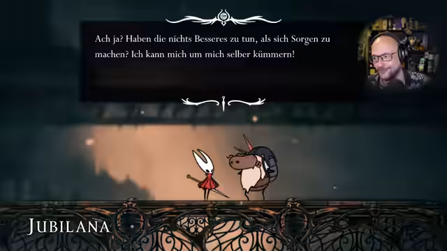 07:52:46Nach dem Sieg über einen Weber-Boss wird die Fähigkeit des fließenden Seiden-Gebrauchs erworben. Während die Gruppe weiter durch die geheimnisvollen Dungeon-Flächen navigiert, tauchen vermehrt Fragen zur Kern-Story von Hollow Knight auf. Es wird über die Beziehungen zwischen den Göttern wie Pale King (Vater von Hornet) und der Wunschin Hieras gesprochen, sowie deren Schöpfungen wie Schatten und Motten. Der Streamer bereut es, das ursprüngliche Spiel ohne tiefes Story-Verständnis gespielt zu haben und empfiehlt, für die komplexe Lore („kryptisch“) spezielle Lore-Videos zu nutzen. Es werden weitere versteckte Bereiche, Gegenstände und Rätsel geprüft, wobei eine gescheiterte Suche nach einem Schlüssel im Sand von Karak erwähnt wird.
