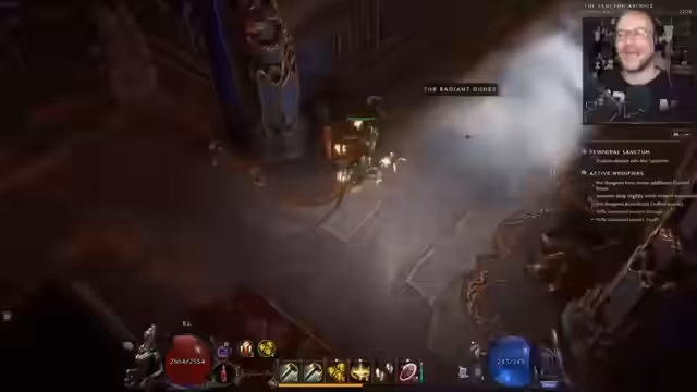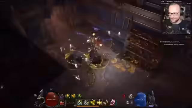 05:17:11Im Dungeon Temporal Sanctum nutzt man Temporal Shift (Taste D), um zwischen Zukunft und Vergangenheit zu wechseln und Gitterstäbe verschwinden zu lassen. Nach dem Besiegen von Gegnern und Champions wird ein Nemesis mitgenommen, der den Titan Heart verstärkt. Auf der nächsten Ebene des Dungeons gibt es einen neuen Modifikator: Gegner droppen mehr Exalted Rings, machen aber auch 20% mehr Schaden und haben 20% mehr Leben. Man kann den Ausgang wählen, um die Modifikatoren nicht zu schwer zu gestalten. Es wird über das Finden von Ausrüstung für andere Builds gesprochen, wie z.B. Bären- oder Void Knight-Builds. Das Spielprinzip, dass man Gegenstände für Builds findet, die man gerade nicht spielt, wird als bekanntes Phänomen beschrieben. Nach dem Besiegen eines Nemesis werden Void Resistance, Necrotic Resistance und Physical Penetration with Bleed gefunden. Die eigene Rüstung wird gelobt, da sie selbst geschmiedet wurde und sehr gut ist. Das Aufwerten von Götzen erfolgt mit den Webern in den Monolithen, nachdem man die Bosse in den Tombs besiegt hat. Es können nur klassenspezifische Idols aufgewertet werden.