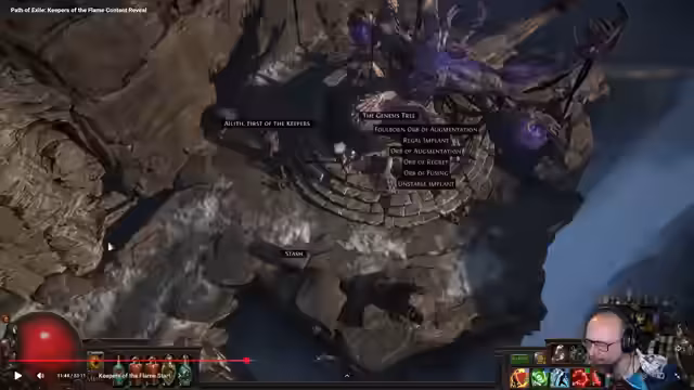 01:11:44Der Streamer wechselt zu dem angekündigten Path of Exile-Content für die neue Liga 'Keepers of the Flame'. Der offizielle Reveal-Trailer wird gemeinsam mit der Community angeschaut. Der Streamer ist sichtlich angetan von der neuen Liga und erkundigt sich im Chat nach den Leckerlis, die im Spiel verfügbar sind, was zu einer interaktiven Unterhaltung führt.