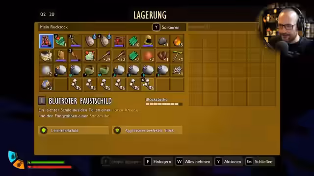 02:52:28In der Basis wird an der Herstellung von Ausrüstung gearbeitet. Ein spröder Schleifstein und spröde Panzerung werden aus Ameisenmaterialien gefertigt. Waffen und Rüstungsstücke können an der Schmiede mit Schleifsteinen bzw. Marmor verbessert werden, was Schaden und Haltbarkeit erhöht. Ein automatischer Reparaturmechanismus existiert nicht. Der Streamer analysiert gefundene Gegenstände wie Skorpionbrochen und Kakerlakenbrochen, um neue Rezepte zu erforschen, und stellt die Herstellung eines Dörrgestells für haltbare Nahrung in Aussicht.