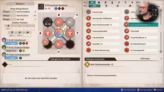 02:11:43Nach dem Kampf geht der Streamer auf das Gameplay-System von Monster Hunter Stories ein und vergleicht es mit anderen Teilen der Reihe. Der Fokus liegt auf dem Ritus der Überlieferung, der es ermöglicht, Gene von einem Monster auf ein anderes zu übertragen. Er erklärt die Funktionsweise des Systems, darunter die neun Gen-Slots, die Bedeutung von Bingos für den Schaden und wie man diese optimiert. Dieses System ermöglicht es, Monsties individualisiert und sehr stark zu machen.