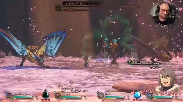 04:17:04Auf die Frage eines Chat-Teilnehmers, ob er das Spiel Crimson Desert spielen wird, antwortet der Streamer, dass er es voraussichtlich am Samstag spielen wird, da er am Freitag höchstwahrscheinlich nicht streamen kann. Bei der Betrachtung der Grafik und des Stils von Monster Hunter Stories 3 vergleicht er diese mit The Witcher, Zelda: Breath of the Wild und insbesondere mit Tales of Arise, wobei er feststellt, dass der Comic-Stil des Spiels schon vor Zelda existierte. Auch die Geräuschempfindungen beim Sammeln von Ressourcen erinnern ihn an die Klanglandschaften von Zelda.