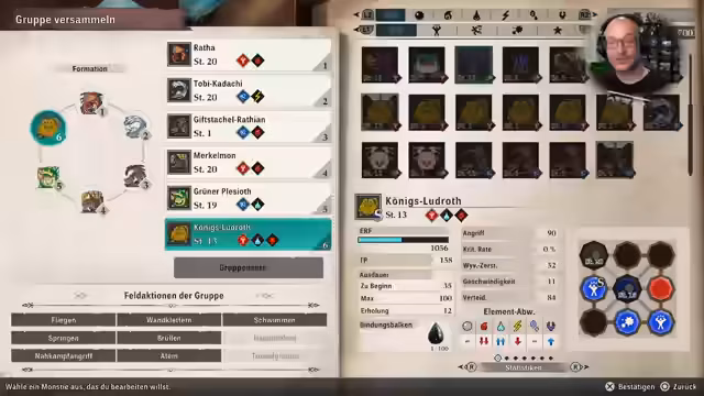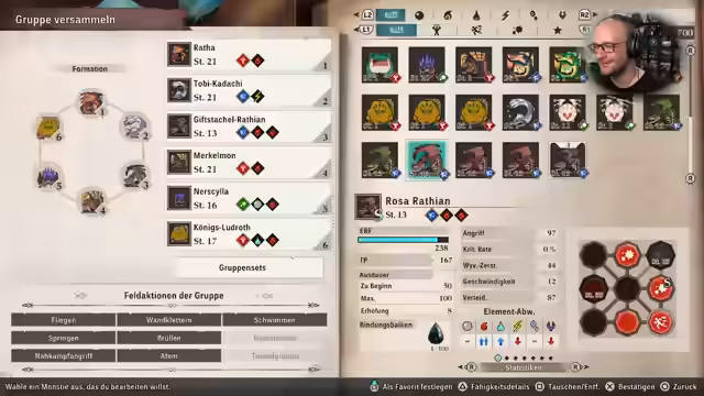 01:08:57Ein zentraler Teil des Streams widmet sich dem Aufbau der Kampfgruppe. Der Streamer erklärt, wie die Teammitglieder je nach ihrer Art in die Kategorien Stärke, Geschwindigkeit oder Technik eingeteilt werden. Diese Einteilung ist für das Scherestein-Papier-System im Kampf entscheidend. Er geht auch auf die Notwendigkeit ein, die Stärken und Schwächen der eigenen Monster zu kennen, sowie die Taktik der Gegner zu beobachten, um im Kampf erfolgreich zu sein. Dies führt zu der Entscheidung, welche Monster für die aktuelle Mission mitgenommen werden.