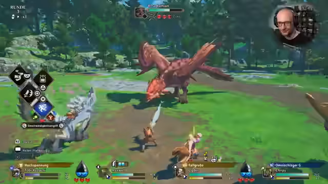 02:34:01Der Stream beginnt mit einem Kampf gegen einen Rathalos. Der Streamer setzt auf verschiedene Angriffsmethoden wie das Abwehrlied und Schlecker Schlitz, wobei er Ladungszeiten und Waffenelemente nutzt. Es werden mehrere Taktiken ausprobiert, um den Schaden zu maximieren und gefährliche Angriffe wie den giftigen Supergiftangriff zu verhindern. Der Fokus liegt darauf, den Schwanz des Monsters zu brechen, um es schwächen. Während des Kampfes werden Verbündete wie Tobi geheilt und der eigene Status mit den Waffenelementen angepasst.